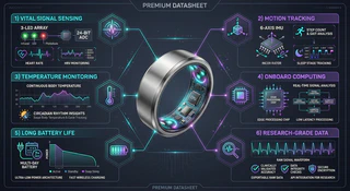 - Vital Signal Sensing — High-fidelity photoplethysmography (PPG) with 3-LED array and 24-bit ADC for heart rate and HRV monitoring