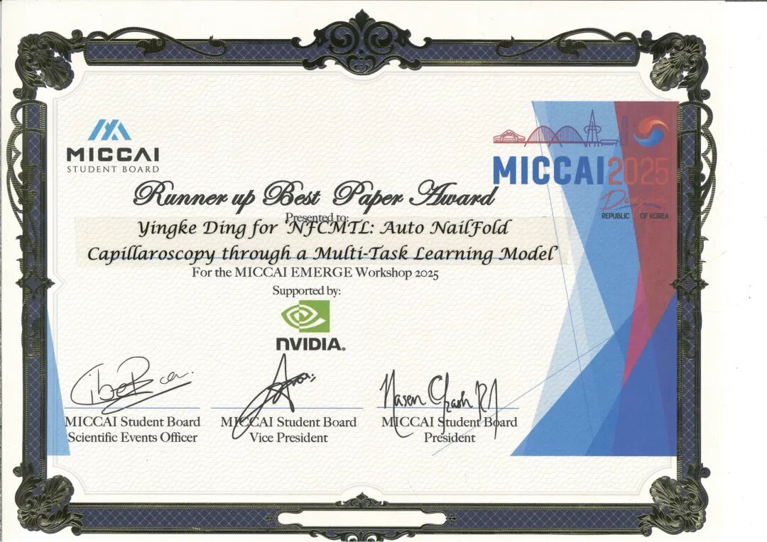 清华大学人机交互与普适计算实验室研究成果“NFCMTL: Auto NailFold Capillaroscopy through a Multi-Task Learning Model”获得 MICCAI EMERGE Workshop 2025 Runner up Best Paper Award(最佳论文二等奖)。 第一作者:丁盈科 • 第二作者:唐健凯 • 通讯作者:王运涛 论文题目:NFCMTL: Auto NailFold Capillaroscopy through a Multi-Task Learning Model 摘要:甲襞毛细血管镜检查是一种通过观察甲襞毛细血管来评估微血管健康的无创技术,在血管和自身免疫性疾病的诊断中起着关键作用。我们提出了一种用于甲襞分析的新型机器…